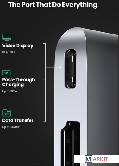 USB-C (Thunderbolt 3) поддерживает сквозную зарядку, передачу данных и видео. |