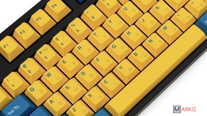 КЛАВИАТУРА БЕЗ КИРИЛЛИЦЫТип: линейныйСила нажатия: 60 грамм (тяжелые)Длина пути: 4 мм (2 мм до срабатывания)Данная модель выполнена в сочетании пурпурно-фиолетового, серого и чёрного цветов, расцветка обязательно понравится любителям сочных, но приглушённых красок. Клавиатура собрана добротно и монолитно, а сочетание высококачественных double-shot PBT клавиш с переключателями Cherry MX и звукопоглощающей подложкой позволяет сделать печать на клавиатуре максимально тихой (насколько это возможно для механики). Mini-USB порт спрятан в центре под корпусом, а на самой клавиатуре имеются центральная и две боковые канавки под кабель.Клавиатура поддерживает сочетание клавиш для регулировки громкости и управления музыкой, также имеется возможность переключения между 6KRO и NKRO.DIP-переключатели на задней панелиДают возможность поменять местами функции кнопок Ctrl и Caps Lock, Windows и Alt, Windows и Fn или отключить Windows.Звукопоглощающая подложкаПоглощает звуки при нажатии, делая процесс печати более тихим по сравнению с обычными механическими клавиатурами.Низкопрофильные клавиши Step-Sculpture2Данные клавиши заметно ниже и имеют оптимальный угол наклона, из-за чего, по отзывам, печатать приятнее и комфортнее, чем на более высоких клавишах.Клавиатура совместима с Mac OSFN-слой работает (кроме клавиш F6, F8, F9), а поменять местами клавиши-модификаторы можно в системных настройках. Проверено с MAC OS 10.13Функция Full N-key Rollover по USB (NKRO)Позволяет нажимать одновременно неограниченное количество клавиш. Для печати идеально подойдет как 6KRO, так и NKRO, независимо от вашей скорости. Для игр NKRO будет плюсом и неважно, нажимаете ли вы больше 6 кнопок или нет, поскольку, играя в любую игру, вы можете случайно нажать пару лишних клавиш и из-за этого клавиатура имеет шанс не среагировать на нажатие, которое вы хотели совершить изначально. Имеется возможность переключения между NKRO и 6KRO через FN сочетания.