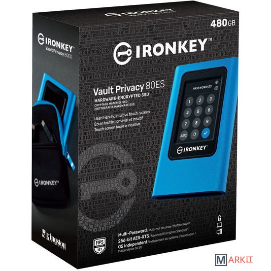 Kingston IronKey Vault Privacy 80 Внешний твердотельный накопитель — это первый инновационный независимый от ОС внешний твердотельный накопитель Kingston с аппаратным шифрованием и сенсорным экраном для защиты данных. VP80ES защищает данные от атак методом перебора и BadUSB за счет прошивки с цифровой подписью. По умолчанию система защиты от атак методом перебора выполняет криптографические стирание накопителя, если пароли администратора и пользователя введены неправильно 15 раз подряд. Накопитель прошел сертификацию FIPS 197 и использует 256-битное шифрование XTS-AES на основе защищенного микропроцессора с сертификатом Common Criteria EAL5+ (CC EAL5+), а также соответствует стандарту TAA.